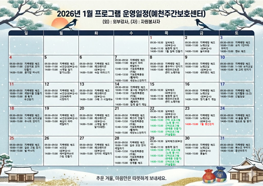 | 제목 | 예천주간보호센터 2026년 01월 프로그램 운영 일정 안내 | 공지일 | 2026.01.07 |