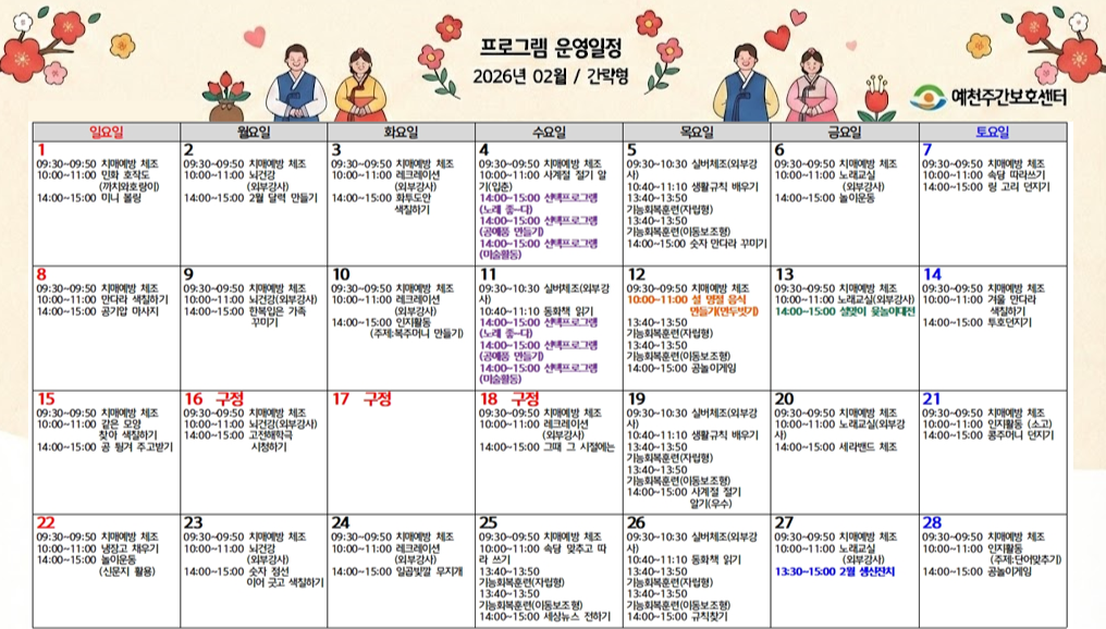 | 제목 | 예천주간보호센터 2026년 02월 프로그램 운영 일정 안내 | 공지일 | 2026.02.04 |