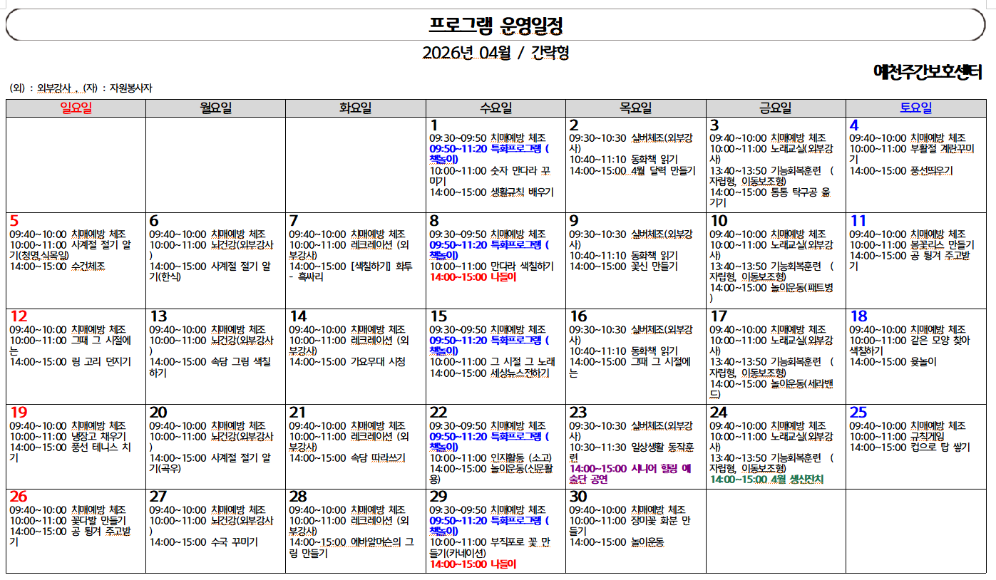 | 제목 | 예천주간보호센터 2026년 04월 프로그램 운영 일정 안내 | 공지일 | 2026.04.03 |
